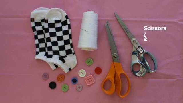 准备好白袜子、纽扣、棉花等,剪一刀。