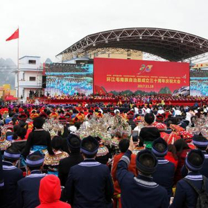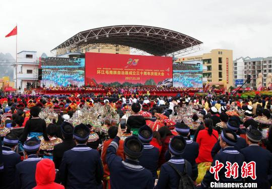 中新网环江11月18日电(记者 杨志雄 黄艳梅)中国唯一的毛南族自治县——广西河池市环江毛南族自治县18日大规模庆祝自治县成立30周年。各族民众盛装打扮,载歌载舞,展示独具特色的毛南族民间民俗文化。