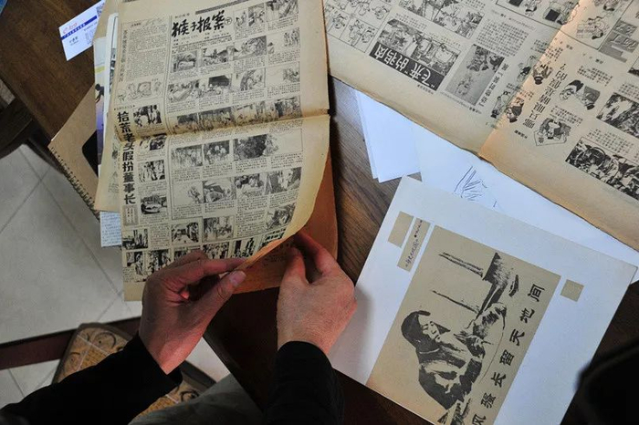 陈汉翔展示20多年前为报刊杂志画的漫画插图。