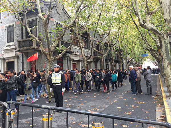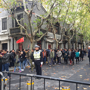 当日上午9时30分许,从兴业路76号正门口排起的长队,一直延伸到了马当路。在靠近黄陂南路(原法租界望志路)的另一端,不少团队游客手举国旗,与会址合影留念。这是连日来兴业路持续出现的热闹景象。