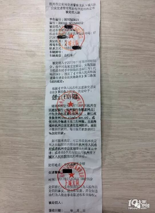 今天早上,中河高架立交桥处,有两人在执勤,我被交警拦下并罚款,理由是违反实施条例第72条第五项规定,罚了10元。