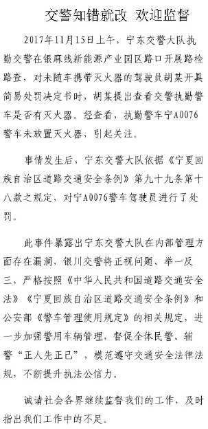 11月15日,银川市宁东交警大队的执勤民警在一处路口开展检查时,对一名未随车携带灭火器的驾驶员开具了简易处罚决定书。此时,驾驶员提出查看交警执勤警车是否有灭火器。经查看,执勤警车宁A0076未放置灭火器。此事被人拍成视频发到网上,引发很多网友关注。