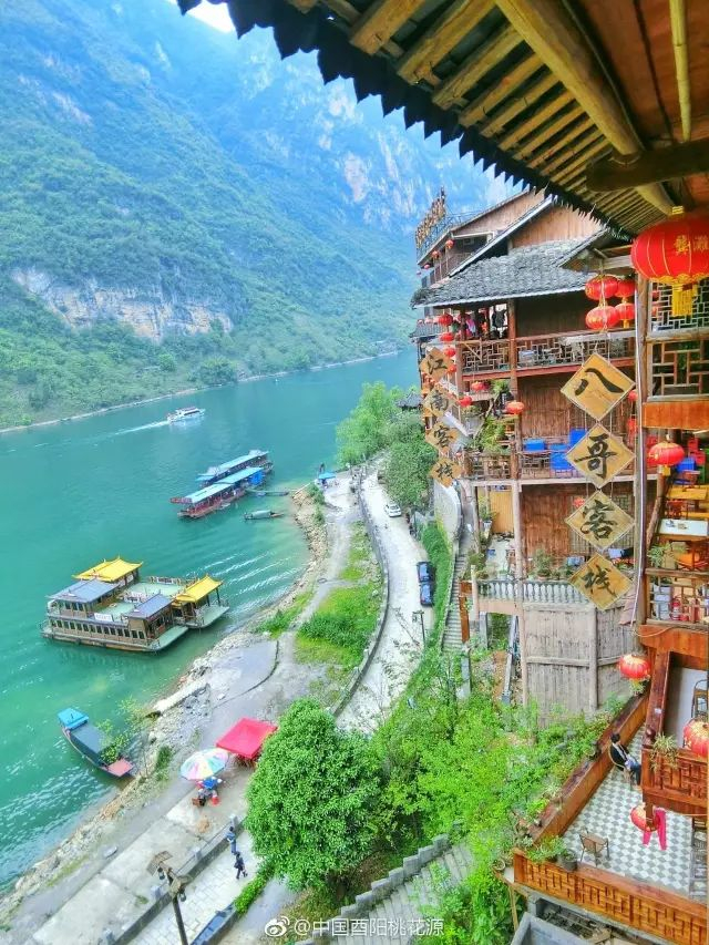 吊脚楼清凉通风,面朝绿水,春暖花开;再加上高高挂着的大红灯笼,河面上的乌江画廊渔歌唱晚,别有一番趣味!