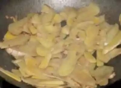 2 焯水后的姜要无油炒一边至完全干水!这样煲出来的姜很清爽,不绵软,久煲不烂!