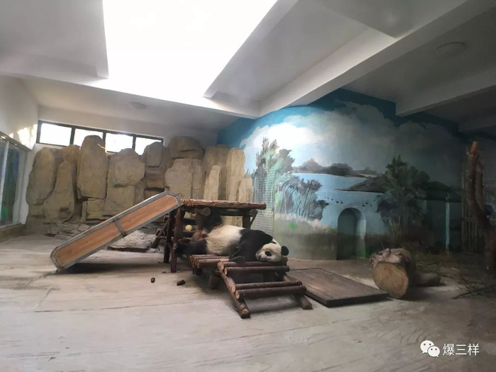 大熊猫馆的暖气隐藏在蓝色墙体内。屋子里暖暖的,大熊猫舒服地睡着了。