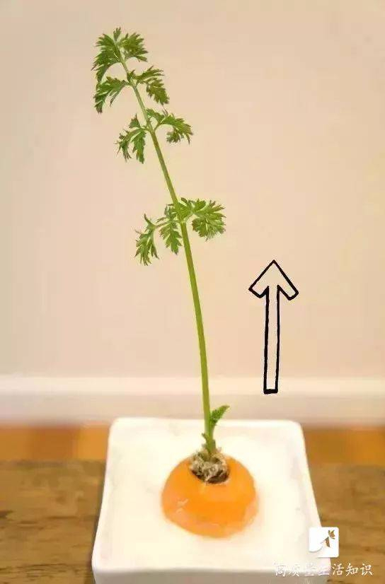 胡萝卜切掉的顶端别急着扔,直接放水裡发芽,长出细长的枝条,一截胡萝卜就是一株漂亮的盆栽。
