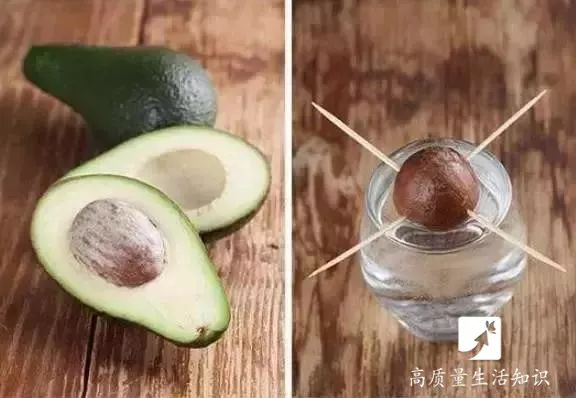 1、将牛油果果核挖出,在上面扎几个小孔。然后把果核用牙签扎几个小洞,固定在水面上,浸泡三分之一左右。