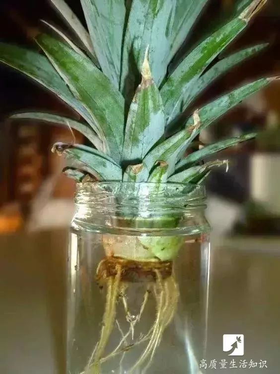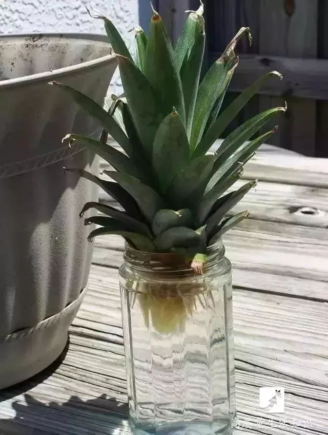 4、可以放置在透明的玻璃瓶中当水培盆栽,或者移植到土壤中,菠萝植株会越长越大棵哦~
