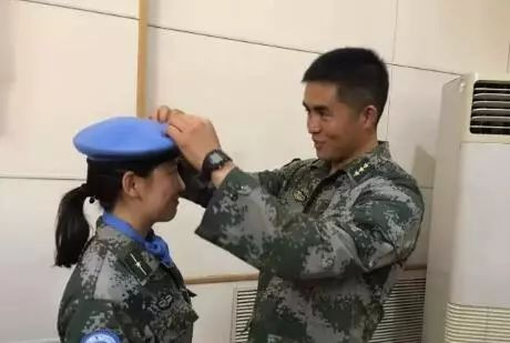 军人夫妻,为即将出征的爱人戴好蓝色贝雷帽。