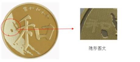 二、隐形图文:位于硬币背面飞白的左上方,倾斜适当角度,可观察到 “和”字。