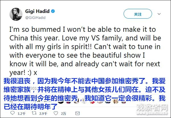 吉吉与美国时间11月16日发推称,“我很沮丧,因为我今年不能去中国参加维密秀了。我爱维密家族,并将在精神上与其他女孩儿们同在。迫不及待地想看到今年的维密秀,我知道它一定会很精彩。我已经在期待明年了”。