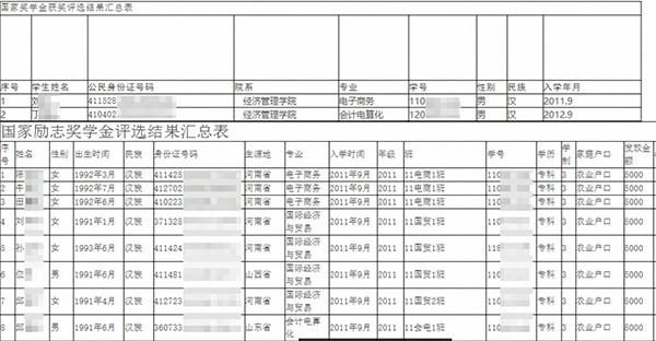 其中,获国家奖学金的两名学生公示信息包括学生姓名、公民身份证号码、院系、专业、学号、性别、民族、入学年月等内容;另外78名获国家励志奖学金的学生和635名获国家助学金的学生公示信息包括姓名、性别、出生时间、民族、身份证号码、生源地、专业、入学时间、年级、班、学号、学历、学制、家庭户口、发放金额等内容。