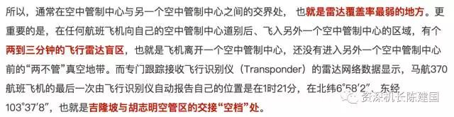 这个缺乏基本的航空常识,在吉隆坡和胡志明之间雷达管制覆盖的区域,基本都可以相互覆盖的,管制区域没有两不管的真空地带,而最后的应答机消失,事后调查是怀疑人为关闭了应答机。