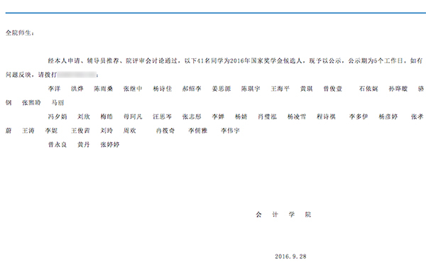 西南财经大学会计学院2016年9月在进行国家奖学金候选人公示时,只公布了该院系学生的姓名,亦无身份证号码。