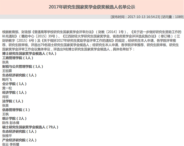 江西财经大学2017年研究生国家奖学金获奖候选人名单部分公示内容,并无身份证号。