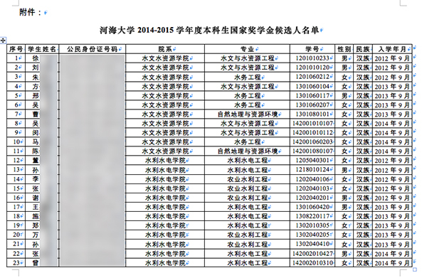其中,河海大学曾对2013年度国家奖学金获奖学生初审名单以及2014、2015年度本科生国家奖学金候选人名单进行公示时,在公布了学生的姓名、院系、专业、学号、性别、民族、入学年月之外,还公布了学生完整的公民身份证号码。
