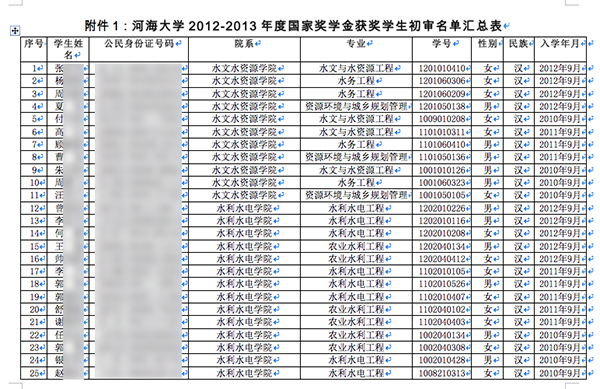 河海大学2012-2013年度国家奖学金获奖学生部分名单。图片系澎湃新闻基于保护隐私需要打码,原页面没有打码。