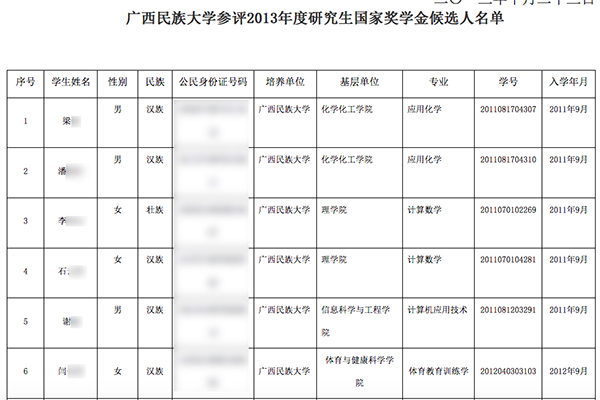 广西民族大学则于2013、2014年进行年度研究生国家奖学金候选人名单公示时,在公布了学生姓名、性别、民族、院系、学号、入学年月之外,公布了学生完整的公民身份证号码。