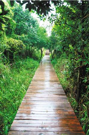 沿着长长的木栈道,走在植被茂盛的湿地里,聆听着鸟鸣虫叫,原生态美景尽揽眼底。