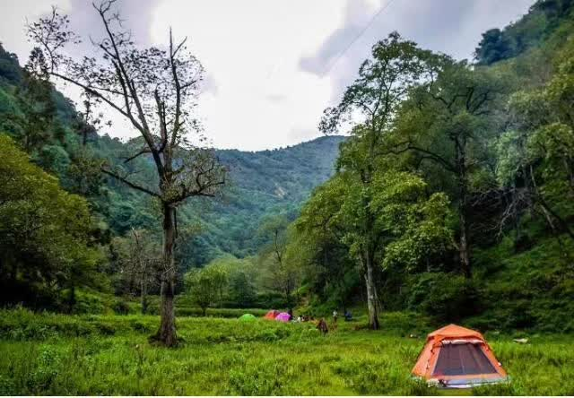 幽深的山谷临水,谷底流水潺潺,花香幽谷,树影随风而动。湖光山色、鸟语花香,是驴友超爱的露营地。