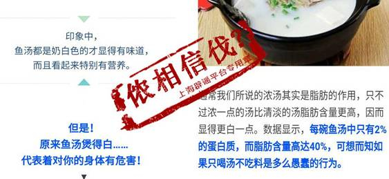 对于鱼汤炖得越白脂肪含量越高的说法,中央电视台财经频道大型互动求证类节目《是真的吗》曾经专门做过测试。