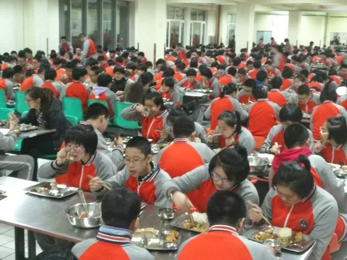 一楼小学部食堂悬挂的是配有彩图的维生素家族、矿物质蔬菜。二楼初中部食堂悬挂的是古诗、名言……张亚清说:“好的形式更要有好的内涵。我们不但用趣味展板,吸引学生的视觉,给其以知识。更重要的是,在食品安全上要做好,确保餐饮购货渠道安全可靠,肉、油、米、面、菜等都是和知名品牌对接。早、中、晚,万余名师生就餐,食堂员工凌晨就开始准备,确保饭菜营养、卫生,每周30多种菜品不重样。”