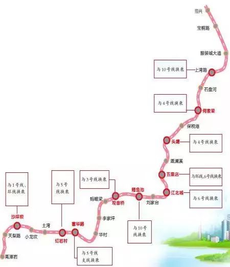 线路从沙坪坝高滩岩到渝北回兴,连通了沙坪坝区、渝中区、江北区和渝北区,途经化龙桥、观音桥江北城、寸滩等区域,共有24个站点!
