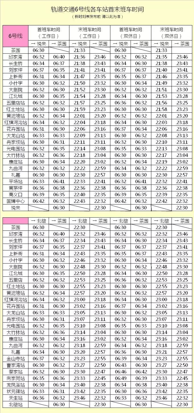 同时,6号线茶园——北碚段工作日最大上线列车数增加5列,由原来32列车增加至37列车;双休日上线列车数增加4列,由原来23列车增加至27列车。礼嘉——悦来段上线列车数量不变,仍为4列车。