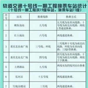 值得一提的是,轨道十号线一期工程,是重庆市轨道交通第二轮建设的骨干线路之一,先南北后东西走向。始于鲤鱼池站,止于王家庄站,途经江北区、两江新区、渝北区,线路全长34公里。其中重庆北站南广场站、悦来站、王家庄站将是多条线路换乘大站。