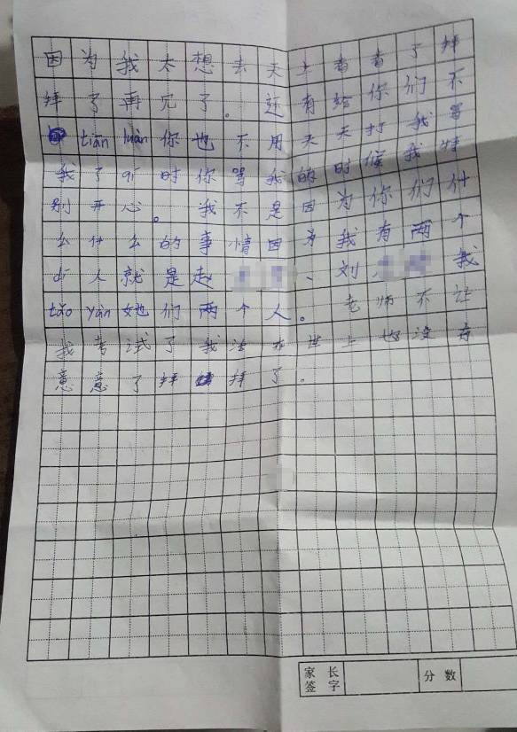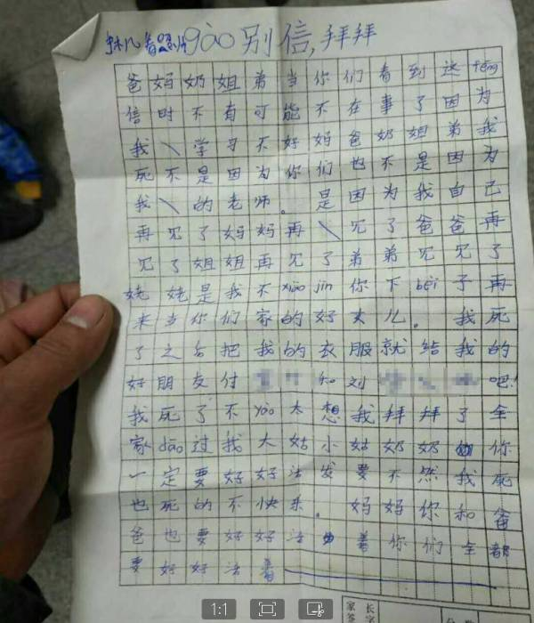 爸妈奶姐弟当你们看到这feng信时不(应该是我)有可能不在事(世)了(。)因为我学习不好(。)妈爸奶姐弟我死不是因为你们也不是因为我的老师。是因为我自己(。)再见了妈妈再见了爸爸再见了姐姐再见了弟弟见(再)见了姥姥(。)是我不xiao jing(估计应该为孝敬)你(。)下bei子再来当你们家的好女儿。