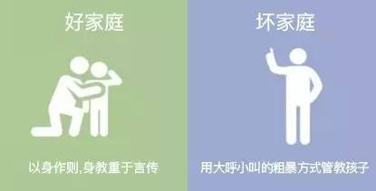 坏家庭:用大呼小叫的粗暴方式管教孩子。坏家庭充满了教条和控制,父母把很多自己做不到的事情,都强加在孩子身上,并且如果孩子做不到,就是打骂相加。父母通常霸道强势,说一不二,把孩子逼进死胡同,从不思考自己的问题。