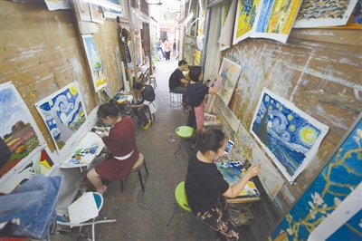 图为11月16日,在大芬村街头走廊过道里作画的画工们。