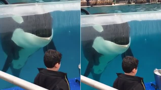 动物园的工作人员告诉小男孩,如果他一直转圈,虎鲸就会模仿他。果然在小男孩转圈一秒后,虎鲸也来回摆动身体,开始转圈。