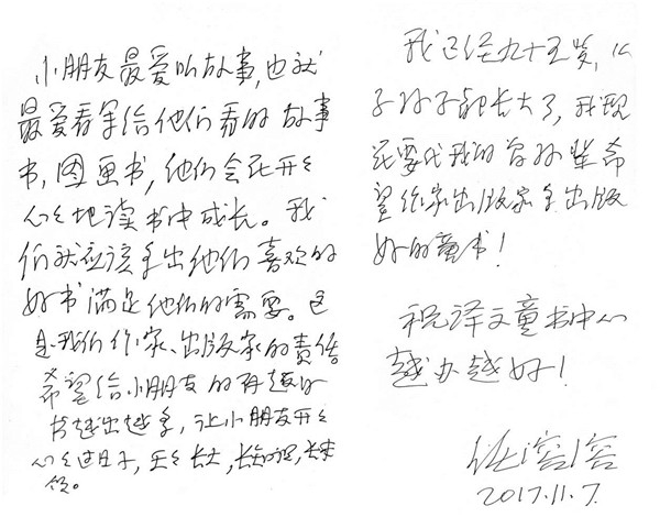 我已经九十五岁,儿子孙子都长大了,我现在要代我的曾孙辈,希望作家、出版家多出版好的童书!