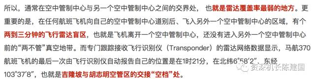 这个缺乏基本的航空常识,在吉隆坡和胡志明之间雷达管制覆盖的区域,基本都可以相互覆盖的,管制区域没有两不管的真空地带,而最后的应答机消失,事后调查是怀疑人为关闭了应答机。