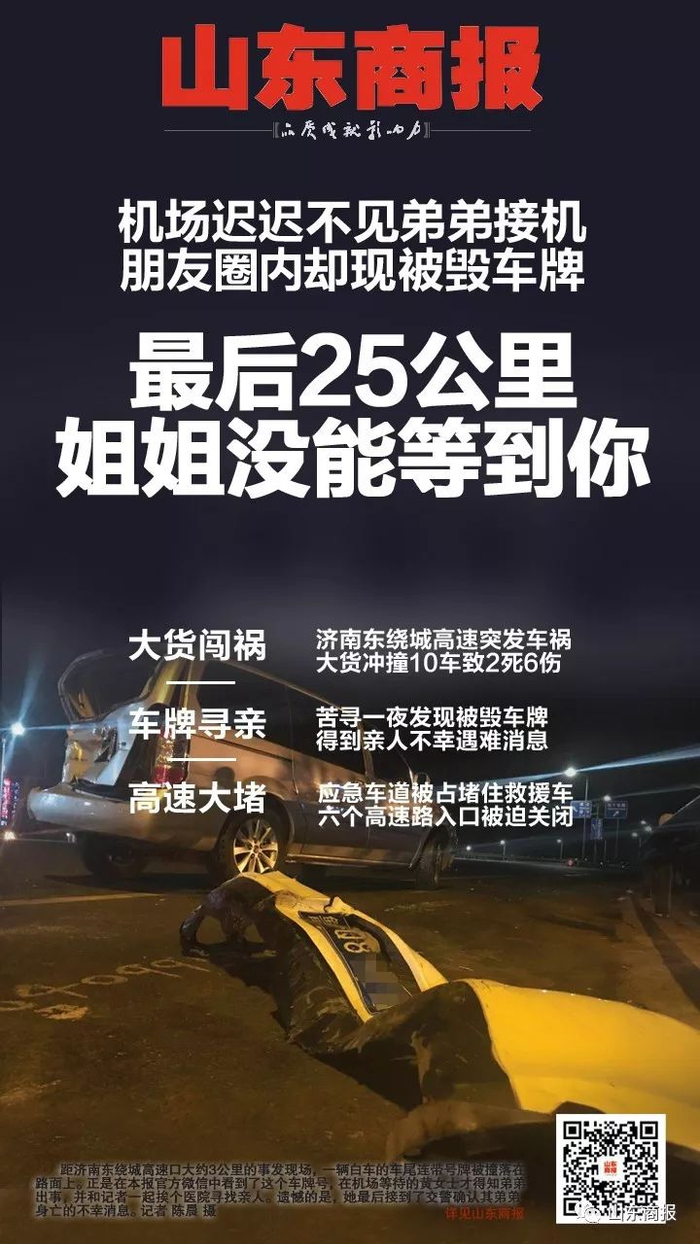 黄女士告诉记者,她在事故车辆中,看到了自己弟弟的车牌号。“我是莱芜人,我休假回来,今天晚上到济南机场。我弟弟下午5点30分左右,在莱芜北上高速,来济南遥墙机场接我。”黄女士越说越哽咽,“我联系不到他,直到看到了你们的微信。”