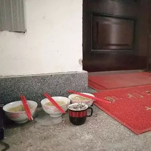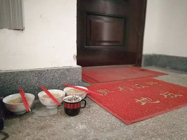 纪尚家楼下的树枝上挂着红色塑料袋,里面装着祭奠逝者的水果和鸡蛋。
