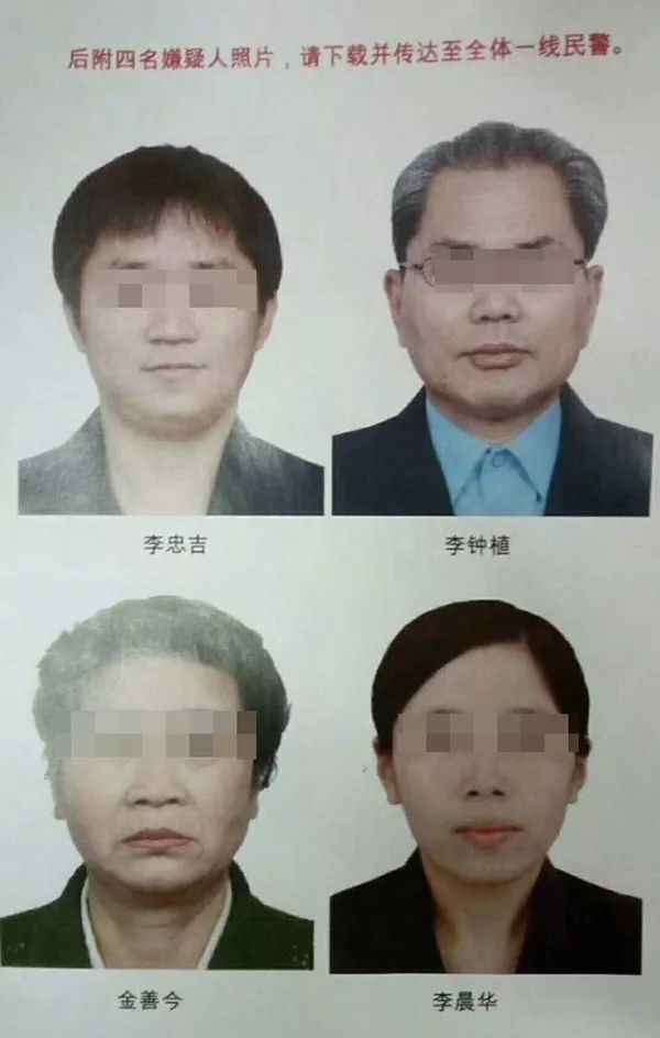 案发后,警方将目标锁定在租住601房的租客。此后发出的协查通报称,4人有重大作案嫌疑。排在名单首位的犯罪嫌疑人李某,今年39岁,户籍地为吉林省延吉市建工街长海委5组。另有一男一女两犯罪嫌疑人均为67岁,男的姓李,女的姓金,户籍地均与李某完全一致。4名嫌疑人中最年轻的是一名31岁女子,其户籍地为吉林省龙井市。