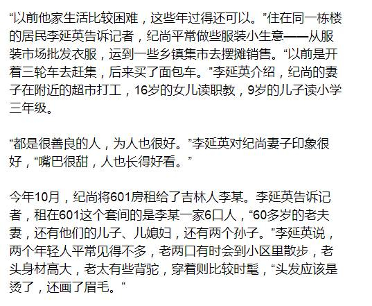 在六楼的出租房内,纪尚和他妻子、儿子的遗体被警方发现,他女儿则死于楼上的家中。