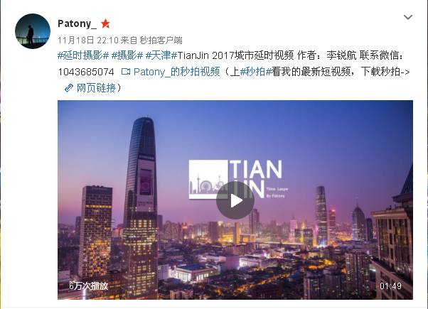 他在自己的微博上发布这段延迟摄影,被网友评为天津最美延迟摄影,让天津美出新高度!目前,该视频在网上的点击量已快50万次。