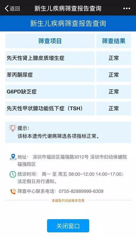 当然,如果爸妈粗心忘记了,对于那些检查有异常的宝宝,深圳市妇幼保健院新生儿疾病筛查中心或采血医院的医务人员会依旧会立即打电话通知其监护人。检查结果如果没有异常,则不会主动通知爸妈,但爸妈还是可以随时随地在微信上查询。