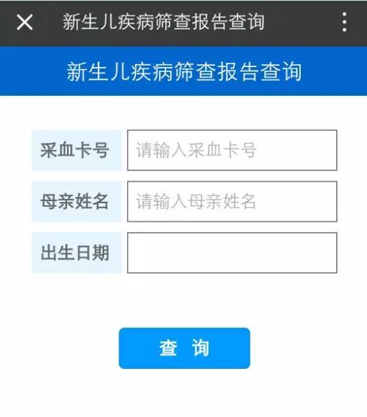 依次输入“采血卡号”、“母亲姓名”、“出生日期”,点击查询。