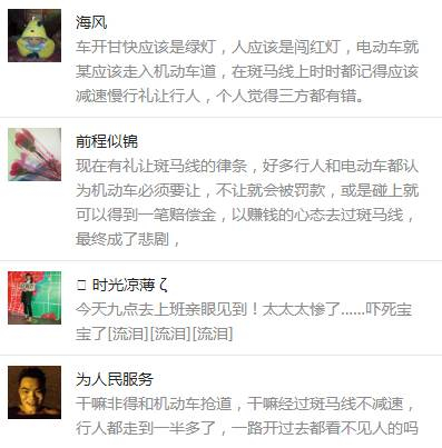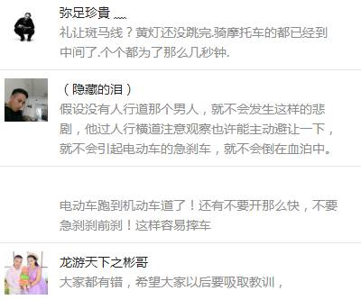 网友“青菜豆腐皮”: 如果中间车道是开着一辆小车,什么事都不会发生,这种车速完全可以刹得住车,最多就是追尾事故而已。其实吊车司机当时太大意了,当时他看到行人已经过到斑马线中间,吊车的行车道前方是通畅的,吊车从行人的后方通过斑马线完全没问题,谁知道中间车道有电动车,电动车为避让行人翻车,骑手摔倒冲入吊车做了轮下鬼。如果中间车道是开着一辆小车,什么事都不会发生,这种车速完全可以刹得住车,最多就是追尾事故而已。