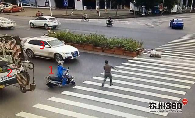 3号白色SUV在斑马线前面,就是看到行人已经走了一般斑马线,但依然加速通过斑马线。即使旁边的1号电动车紧急避让导致车辆失控,SUV还是选择了不礼让行人,具体要不要对事故负责任还看交警部门判定了,最少SUV已经有不礼让行人的违规行为。