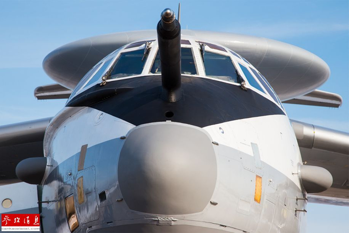 A-50预警机是在伊尔-76МD军用运输机的基础上改装的,A-50U预警机具备800公里范围目标探测能力,6小时连续侦察能力,可同时跟踪300个空中、地面和水上目标。图为A-50预警机机首部特写。