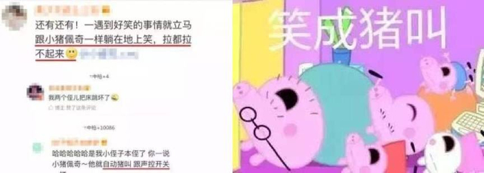 左边家长提出了孩子看完《小猪佩奇》学猪叫的问题,而右边,“笑成猪叫”则是近期十分流行的网络语言。