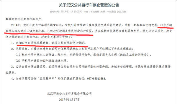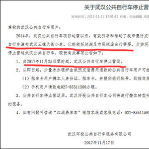 11月17日,武汉环投在其微信公众号"江城易单车"以及官方网站上发布了一则《关于武汉公共自行车停止营运的公告》称: