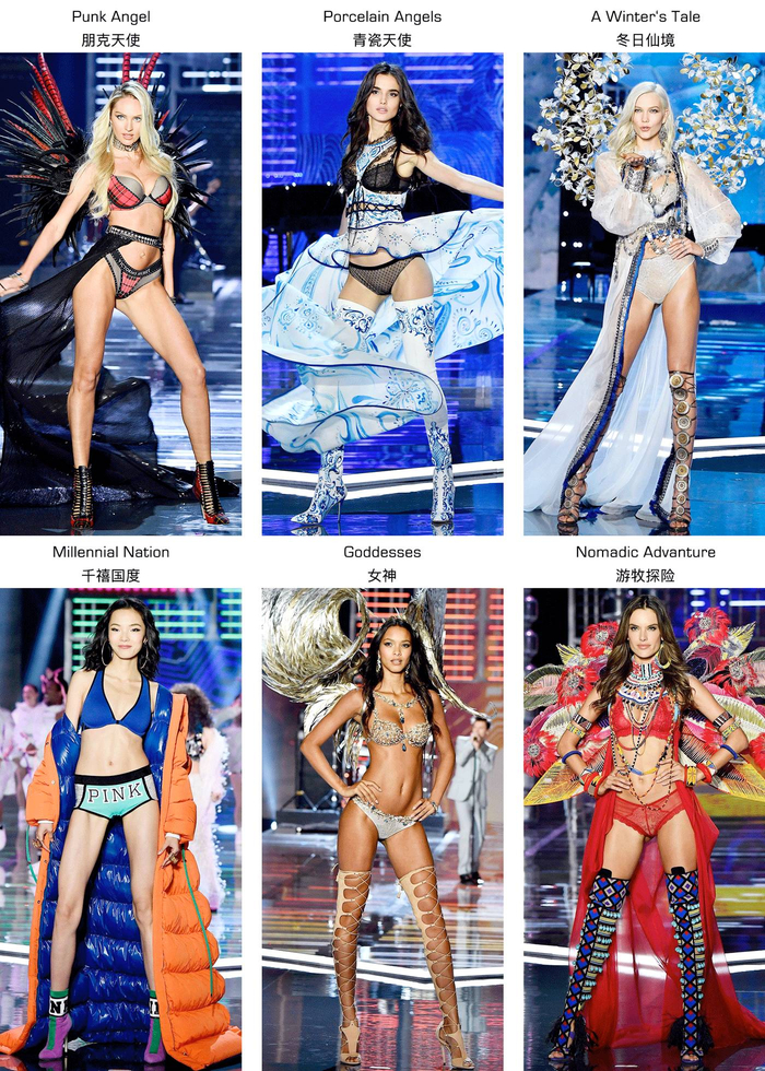 今年的维密秀分为六大主题,分别是:朋克天使(Punk Angel)、青花瓷(Porcelain Angel)、冬日仙境(A Winter's Tale)、千禧国度(Millennial Nation)、女神(Godesses)和游牧探险(Nomadic Advanture)。