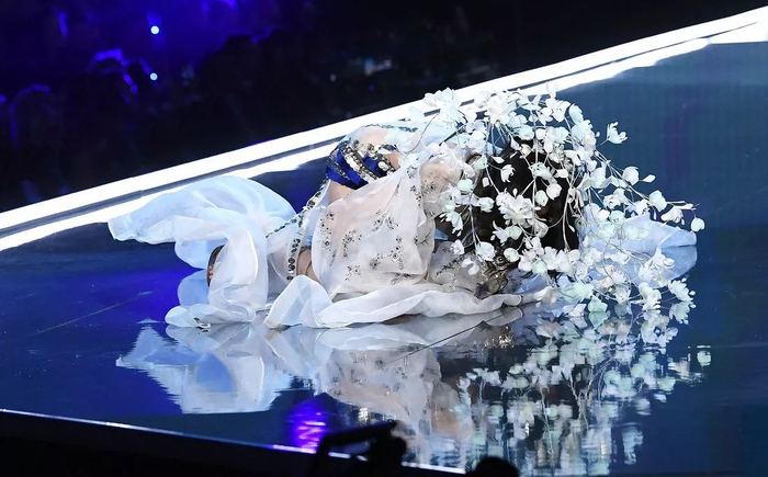 But Xi handled her embarrassing mishap with complete grace. The model perched herself back up onto her knees, adjusted her gigantic floral headpiece and got right back up — with the help of one of her fellow models, of course. After getting back up, Xi posed at the end of the runway like a pro, as if her fall had never even happened.