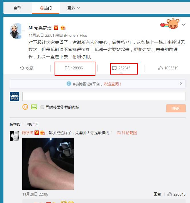 对不起让大家失望了,谢谢所有人的关心,做模特7年,这条路上一路走来摔过无数次…但是我知道不管摔得多疼,我都一定要站起来,把路走完…未来的路很长,我会一直走下去…谢谢你们。